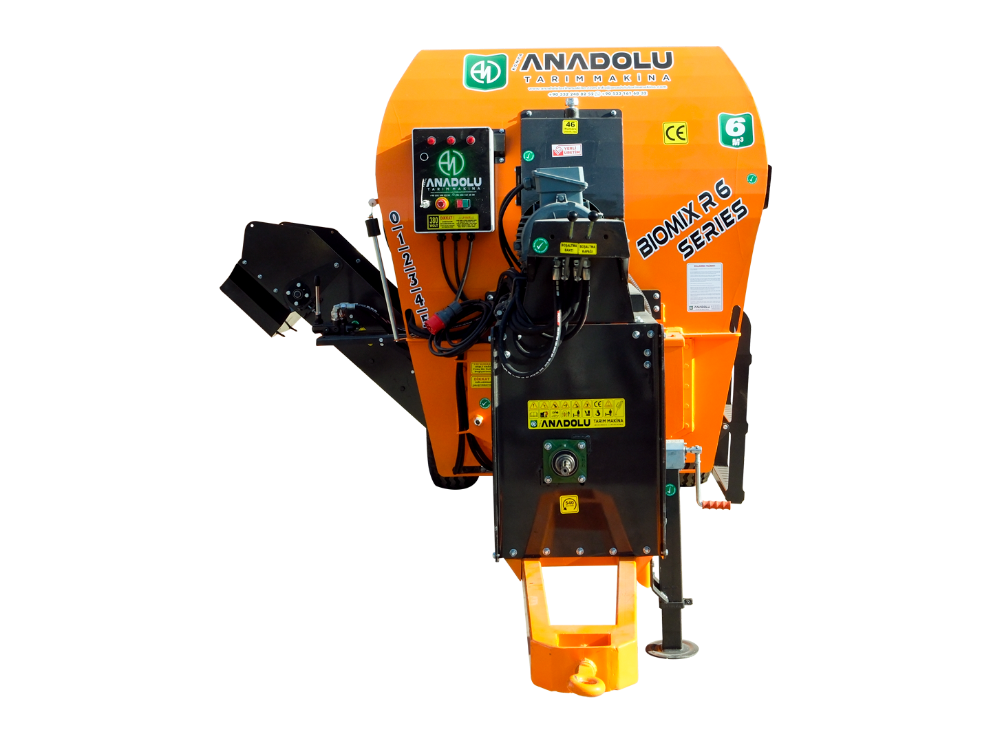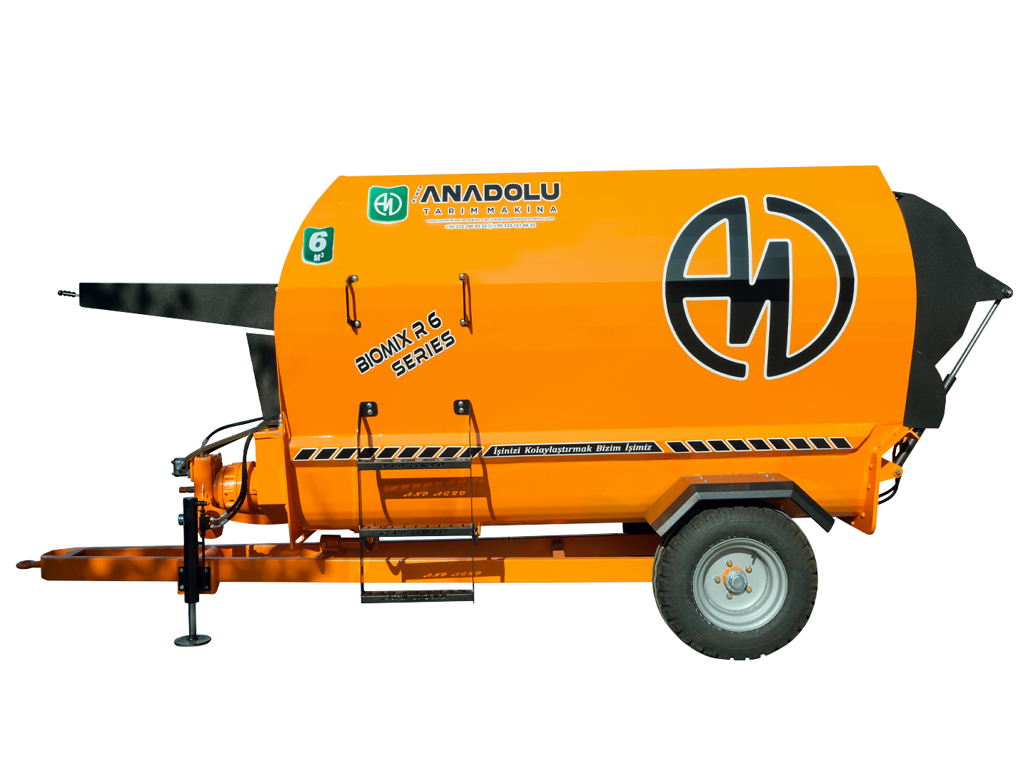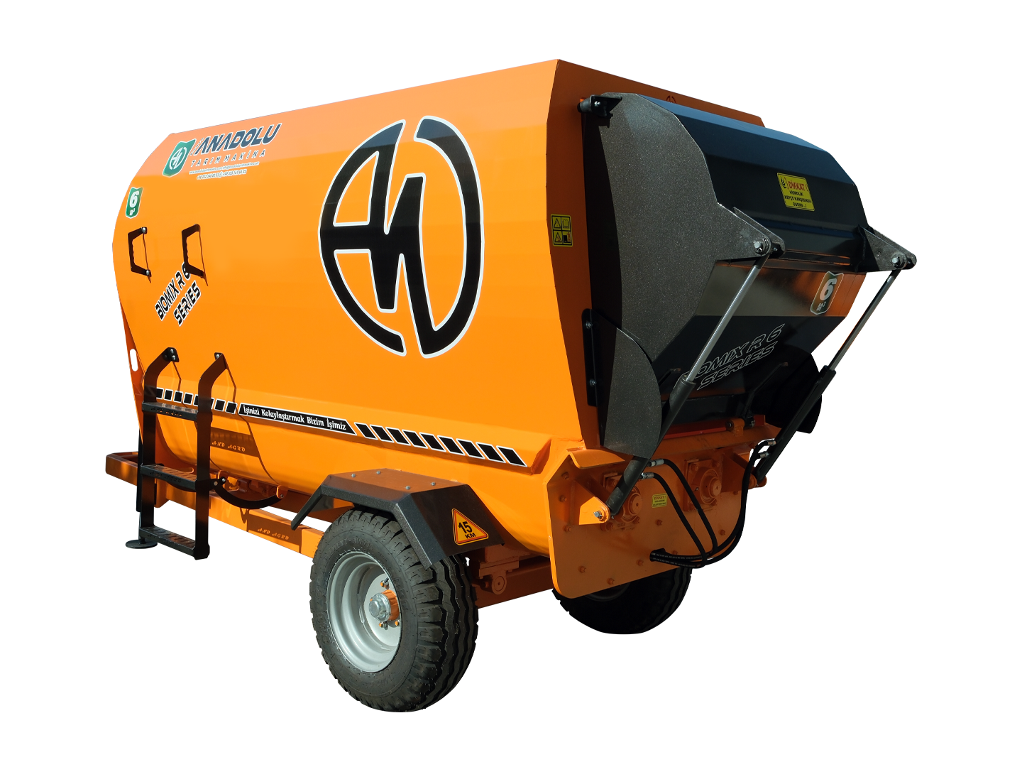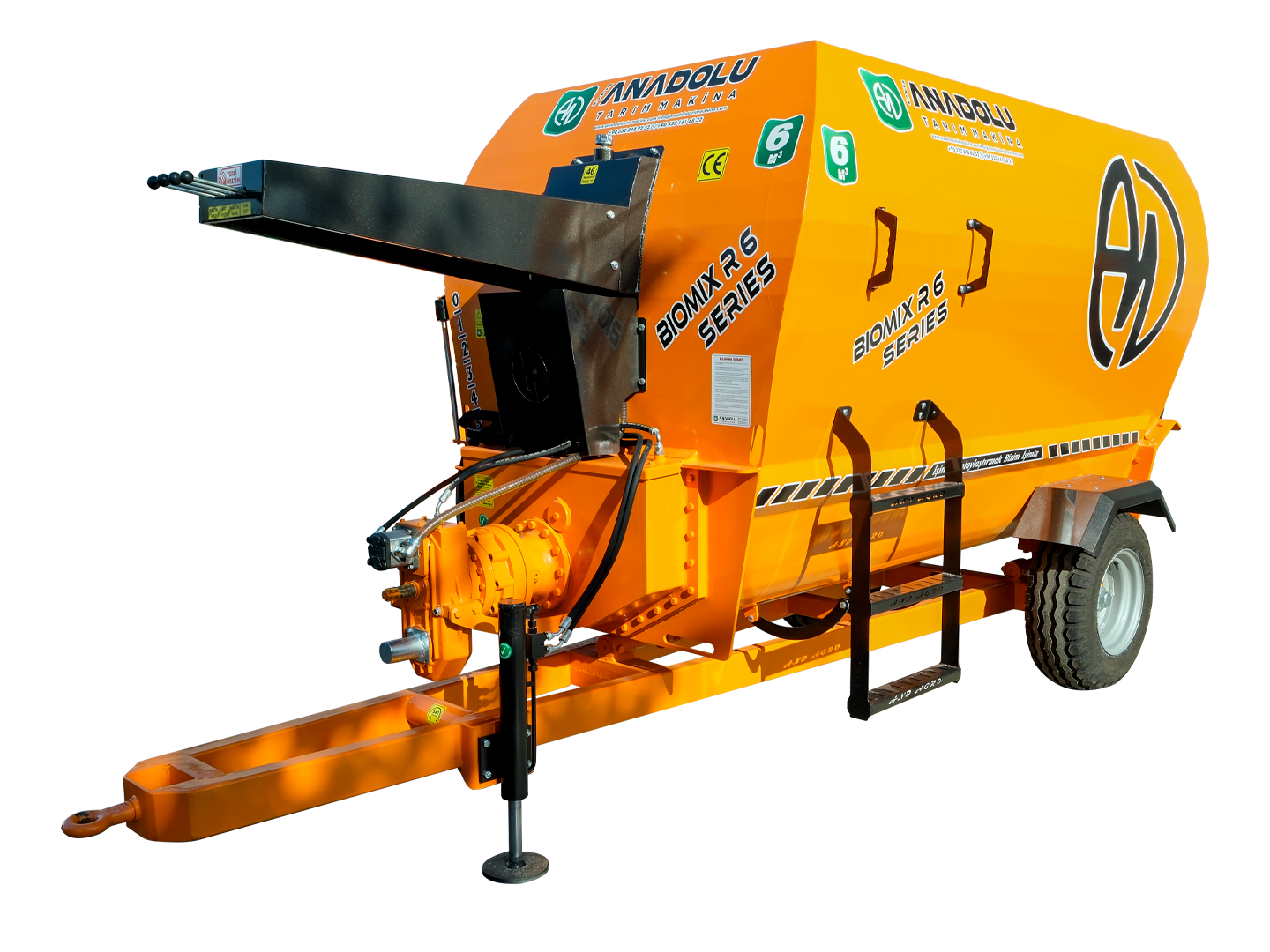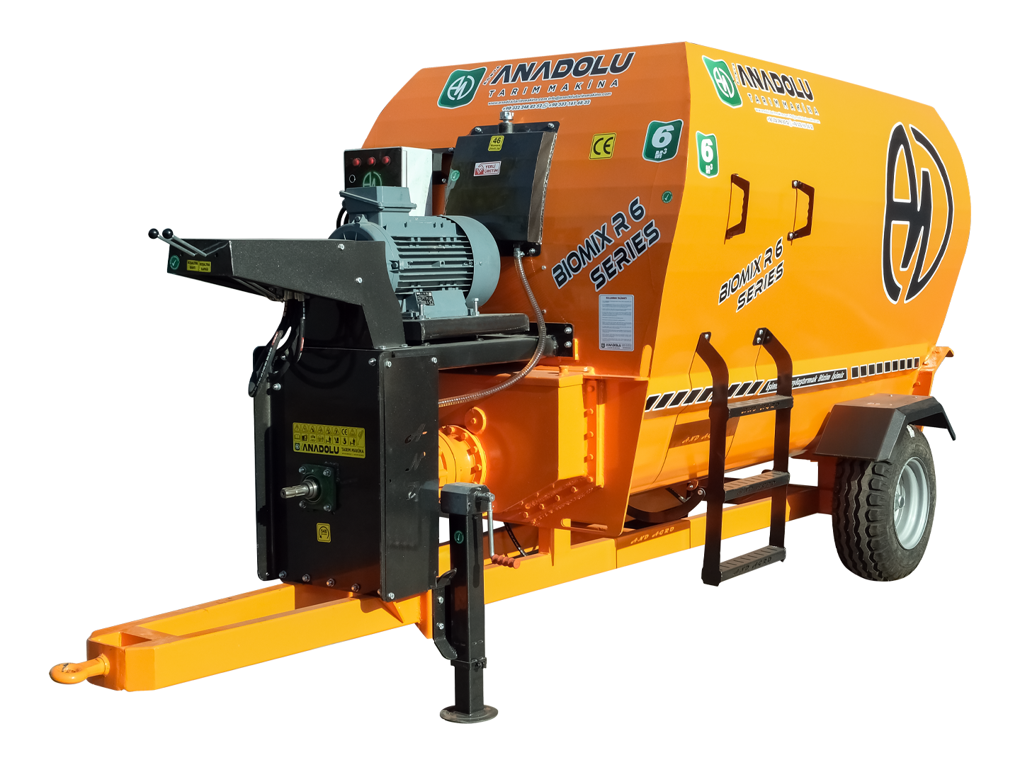 6m³ yatay yem karma ve dağıtma römorkları yatay olarak tasarlanmış iki adet helezona sahiptir. Helezon sistemi son teknoloji ve tecrübe ile geliştirilerek tasarlanmıştır, bu tasarlanmış olan helezon sistemi ile homojenliği %95 seviyesine çıkarabilir, aynı zamanda özel tasarım ve özel malzemeden üretilmiş kıyıcı bıçakları sayesinde partikül büyüklüğünü minimize edebilirsiniz. 6 m³ yem karma ve dağıtma römorku 100 ile 110 büyükbaş 400 ile 500 küçük baş hayvana yem hazırlayabilmektedir yatay yemkarma ve dağıtma römorkları istenilen ebat ve özelliklerde isteğe bağlı olarak traktörlü, elektirikli ve elektirikli / traktörlü olarak üretilebilir.